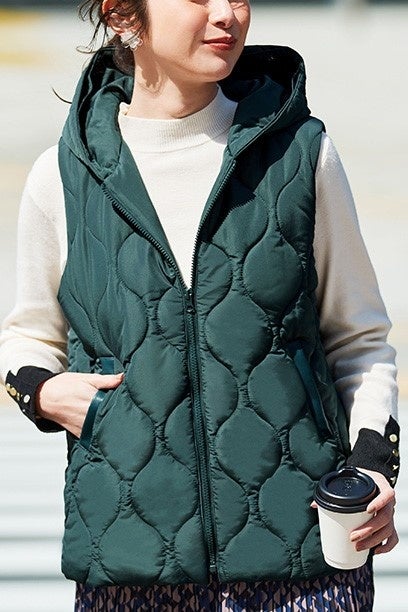 ■特長:ロング丈パーカーとひょうたんキルトの中わたベストでトレンド感のあるレイヤードアウター。