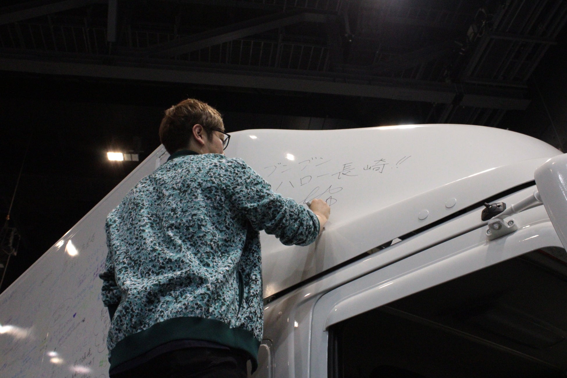 長崎スタジアムシティキャラバンカーに直筆サインとメッセージを寄せ書きしていただき、そのままキャラバンカーに乗り込んで「いってきます!」と会場を後にしました。