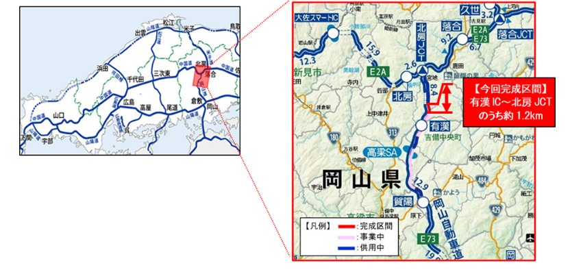 E73 岡山自動車道 有漢IC~北房JCTの一部で4車線化工事が完成します