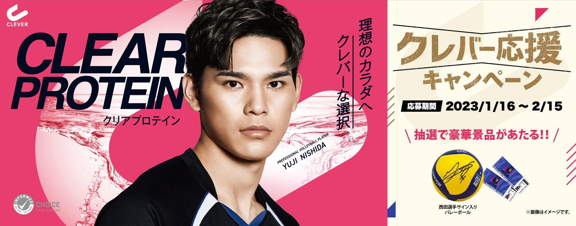 サインボール以外にも西田有志選手が所属するチーム「ジェイテクトSTINGS」と、ネイチャーラボが運営するチーム「東京グレートベアーズ」のホームゲーム観戦チケット*も当たります。また西田選手が推薦する「クレバー クリアプロテイン マッスル」も合わせてプレゼント。この機会に是非奮ってご応募ください。