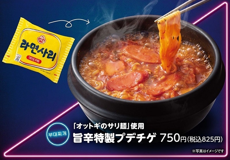 有名な韓国ドラマにも登場した、若者に人気の鍋料理。魚介・牛肉のだしを加え、コクと旨みのあるピリ辛スープに仕上げました。中には太麺でコシの強いオットギのサリ麺が。アツアツの石鍋で食べる満足感の高い逸品です。