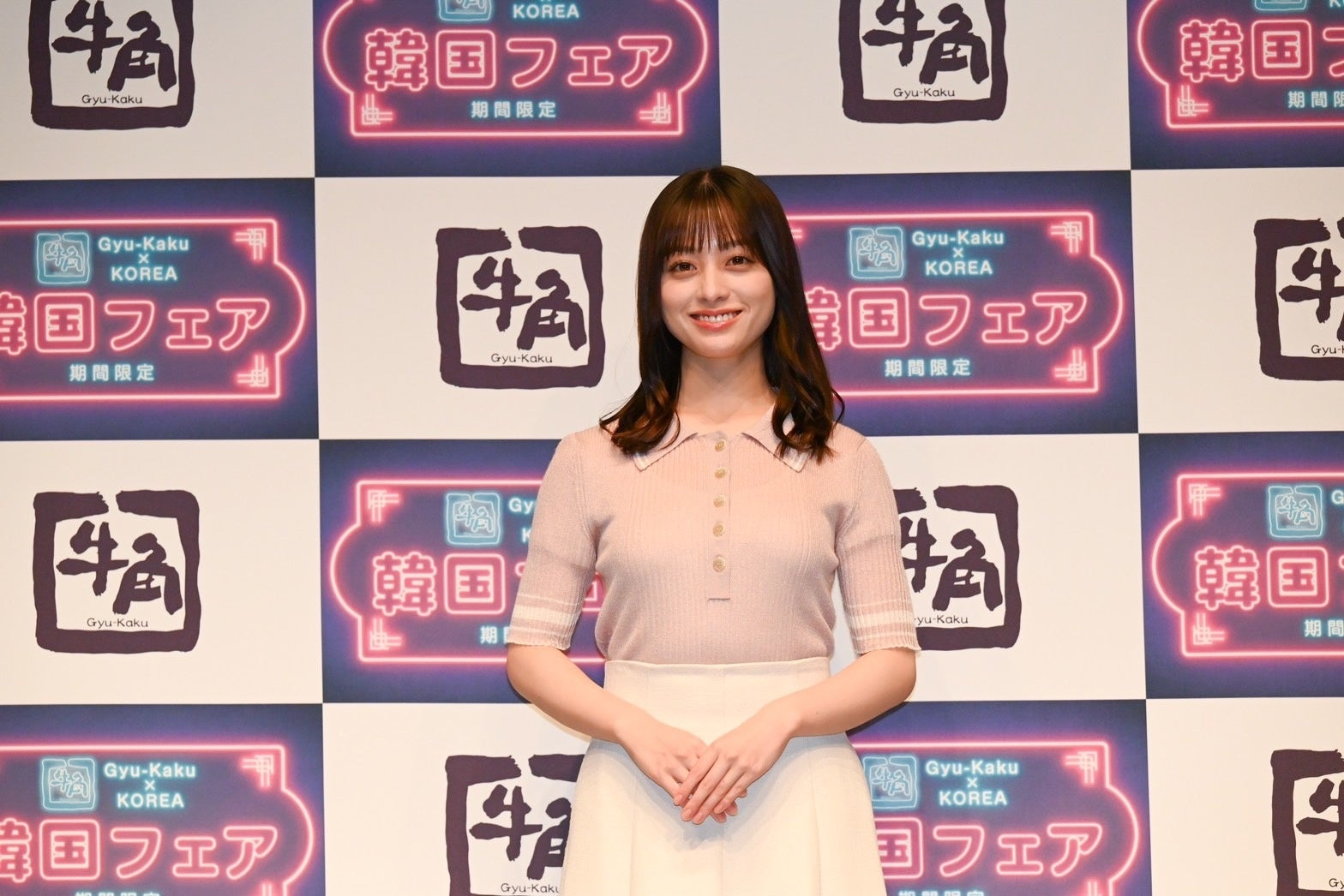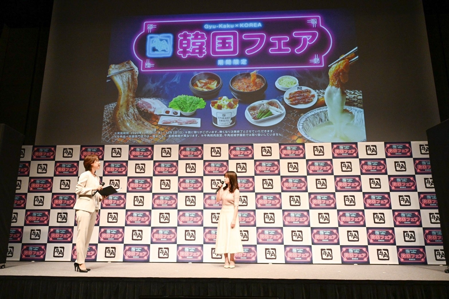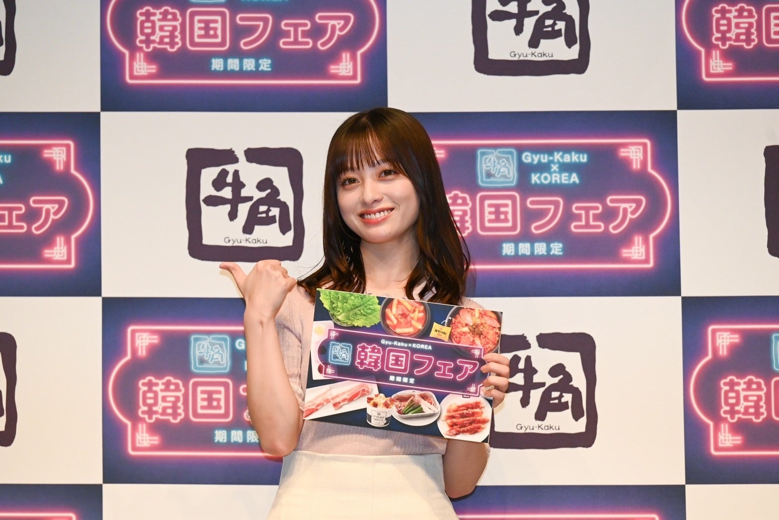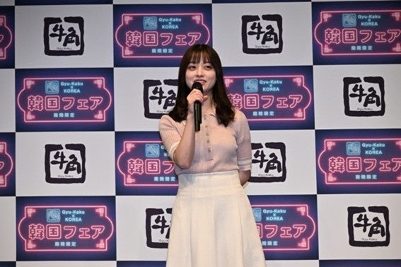 牛角のCMキャラクターである橋本環奈さんが登壇。韓国フェアのメニューの実食のほかCMキャラクターとしての反響や、新CM「牛角激ウマ」篇について語っていただきました。