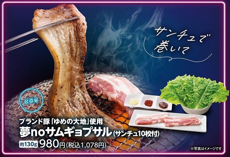 焼いた豚バラ肉をサンチュで巻いて食べる、韓国料理定番のサムギョプサル。肉にこだわる牛角では、北海道産ブランド豚「ゆめの大地」を使用しました。