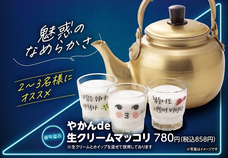 フレッシュな風味とコクが特長の生マッコリに生クリームとホイップクリームを混ぜ合わせた、ふわっとした口当たりの牛角流マッコリ。ヨーグルトのような酸味とクリームの甘みがやみつきになる味わいです。やかんの入れ物とかわいいショットグラスで見た目でも楽しめます。韓国では、酒店でマッコリを販売する単位がやかんだったことから、今でもやかんでマッコリを嗜む文化が残っています。