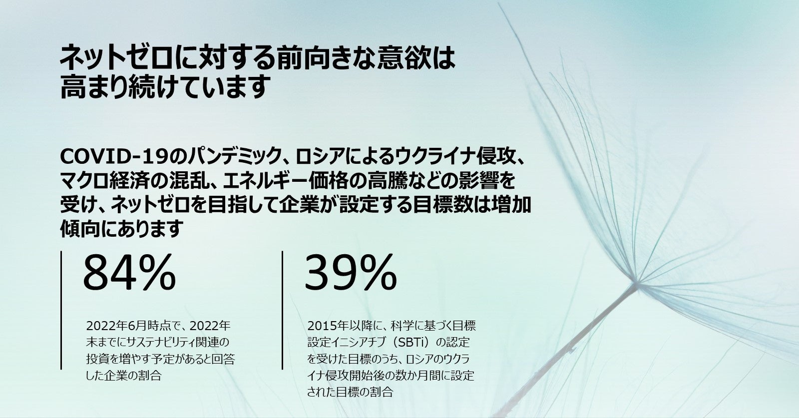 世界の公共および民間の有力企業2,000社の排出削減目標とデータの分析結果に基づき作成されたアクセンチュアの最新調査レポート「Accelerating global companies toward net zero by 2050(邦題:2050年のネットゼロ達成に向けて加速するグローバル企業)」によると、あらゆる地域で多くの企業が脱炭素目標を設定しており、科学に基づく目標設定イニシアチブ(SBTi:Science Based Targets initiative)の認定を受けた目標数は、今年、記録的に増加しました。その一方で、エネルギー価格の高騰と供給不安が拡大している影響もあり、ネットゼロ目標の達成が困難であることが明らかになりました。なお、別の調査では、84%の企業が「2022年末までにサステナビリティ関連の投資を増やす予定がある」と回答しています [2]。