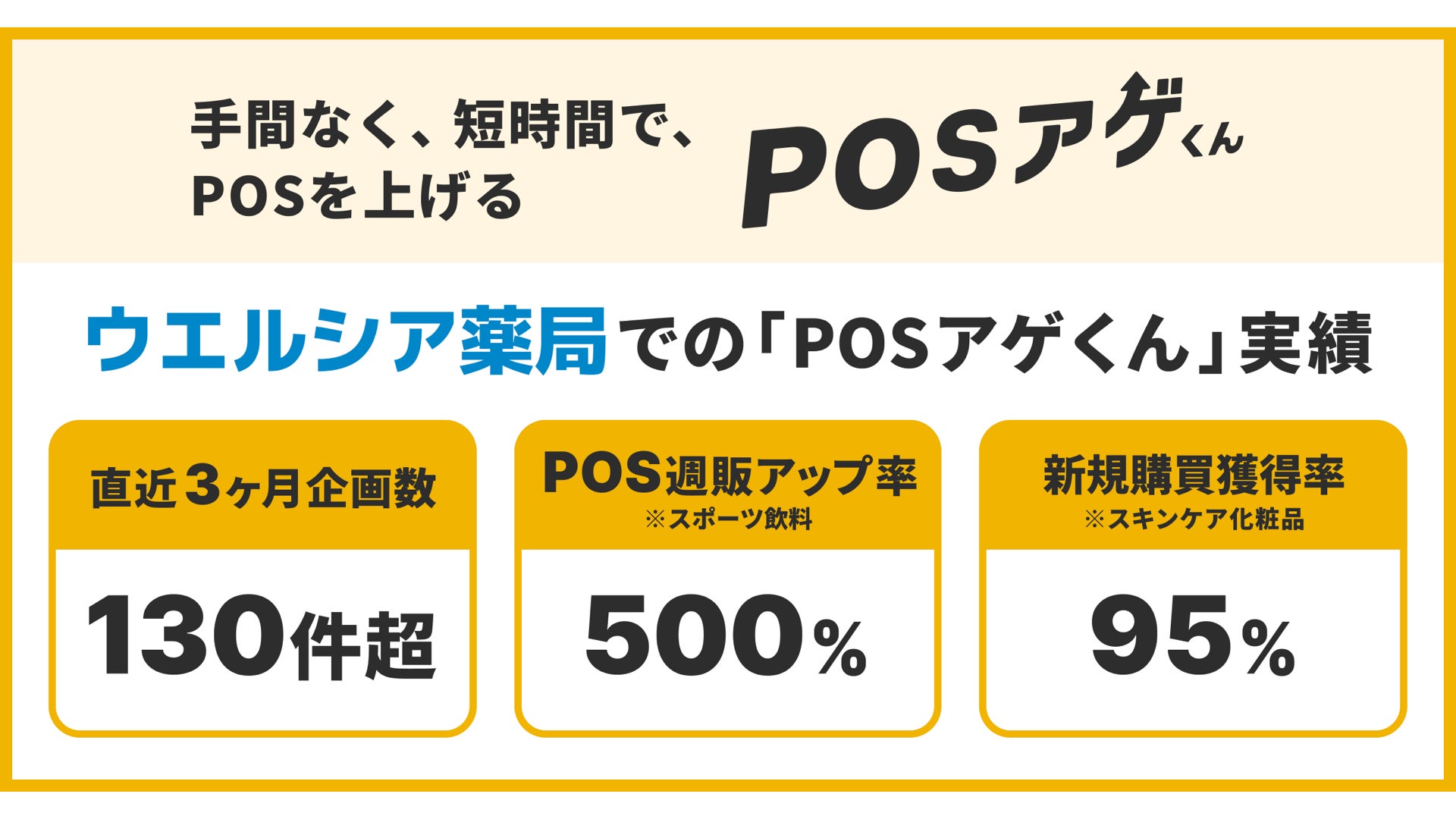ウエルシア薬局においては、「POSアゲくん」を2024年3月に初めて実施いただいて以降、スポーツ飲料のPOS週販500%、スキンケア化粧品の新規購買獲得率95%などの高い効果の事例が続いたことを受けて実施キャンペーン数が増え、直近3ヶ月の2025年10月〜12月では、130件以上の企画実施にまで拡大しています。