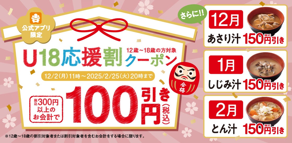 本日から2月25日(火)20時までの期間、吉野家公式アプリで12歳から18歳を対象とした『U18応援割クーポン』を配信します。クーポンの内容は、300円以上で期間中何度でも使用できる税込100円引きクーポンと月替わりで汁物を税込150円引きするクーポンの2種類です。汁物を割引するクーポンは、12月は「あさり汁」、1月は「しじみ汁」、2月は「とん汁」の予定です。店内・テイクアウトともに利用可能です。お会計時に対象者が自身でクーポン画面を提示いただくか、ご一緒に来店されている場合にクーポンを適用します。