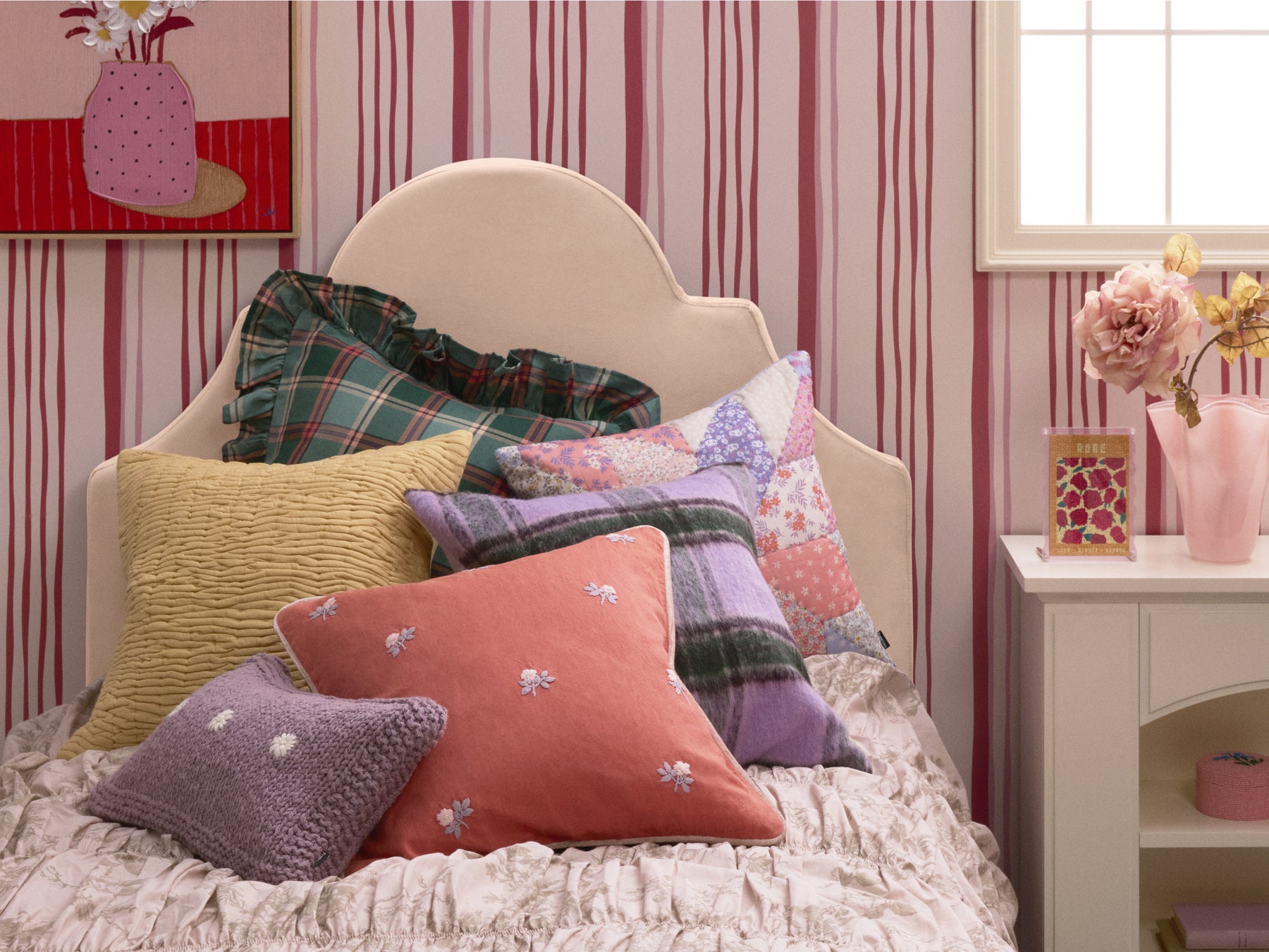 柄やサイズの異なる小花柄をプリントし、パッチワーク風にステッチを施した、懐かしくて温かみのあるデザインのクッションカバーです。