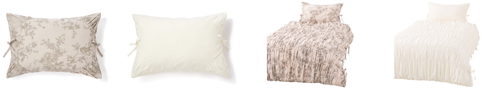 たっぷりとしたギャザーが可愛らしく、両サイドに施した細身のリボンが程よく大人かわいいデザインの寝装品シリーズです。ベージュはベースの色に馴染むような色味でプリントを施したことで、柄ものでありながらも取り入れやすいデザインです。アイボリーはどんなお部屋にも取り入れやすい無地でありながら、立体的な縫製仕様で、華やかな仕上がりとなっています。トレンド感を取り入れた大人かわいいまくらカバーと掛け布団カバーです。