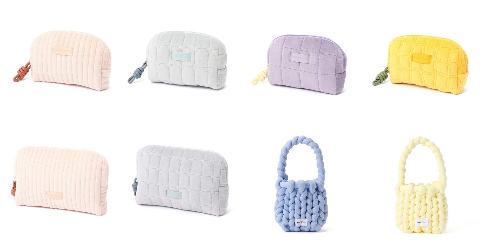 中綿を入れたキルティングにロープをモチーフにした引手がポイントのポーチのシリーズです。シンプルなポーチなので、メイクアイテムはもちろん、小物やガジェットの収納にもおすすめです。