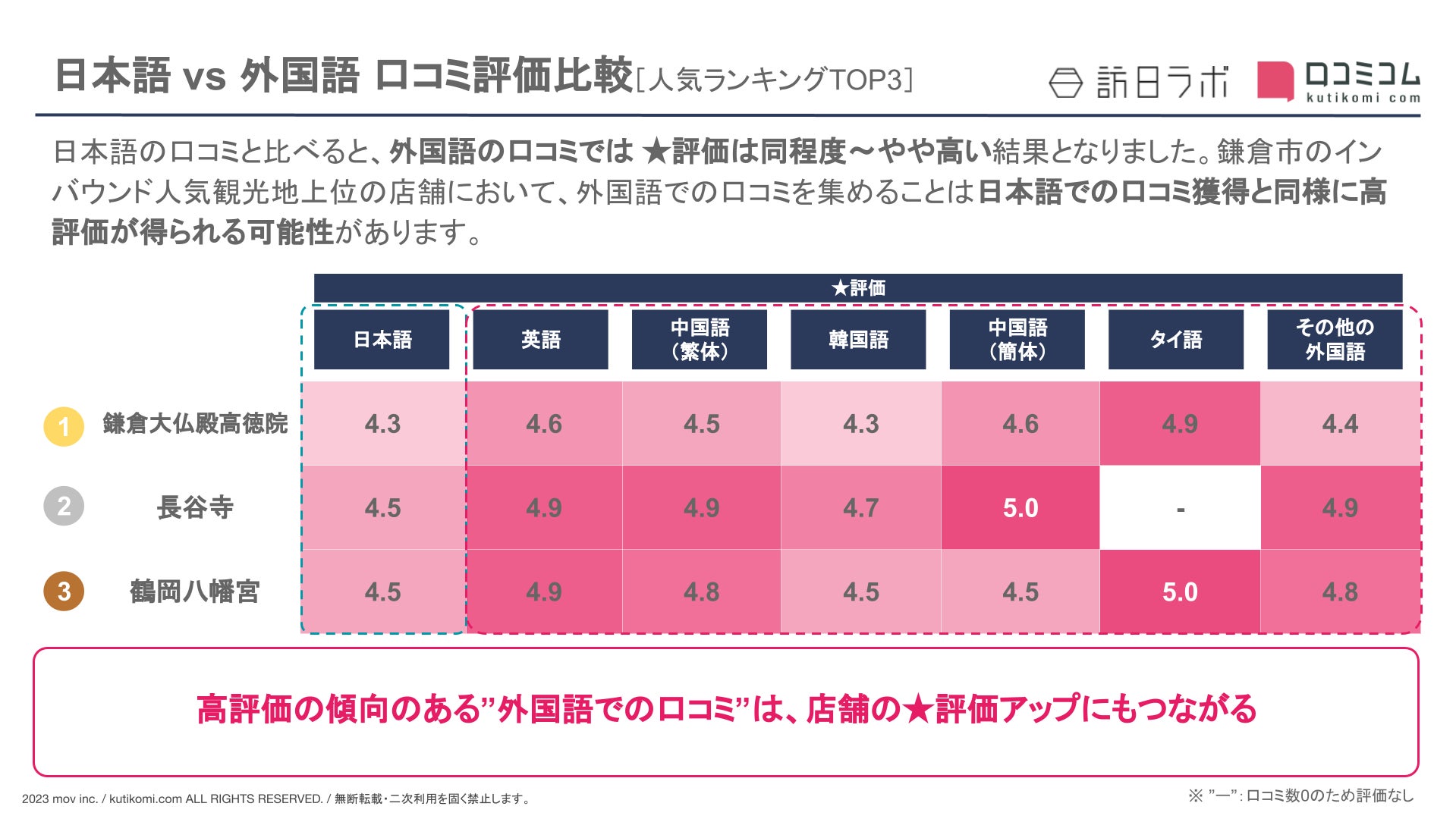 日本語の口コミと比べると、外国語での口コミでは、★評価は同程度〜やや高い結果となりました。鎌倉市のインバウンド人気観光地上位の店舗において、外国語での口コミを集めることは日本語での口コミ獲得と同様に高評価が得られる可能性があります。