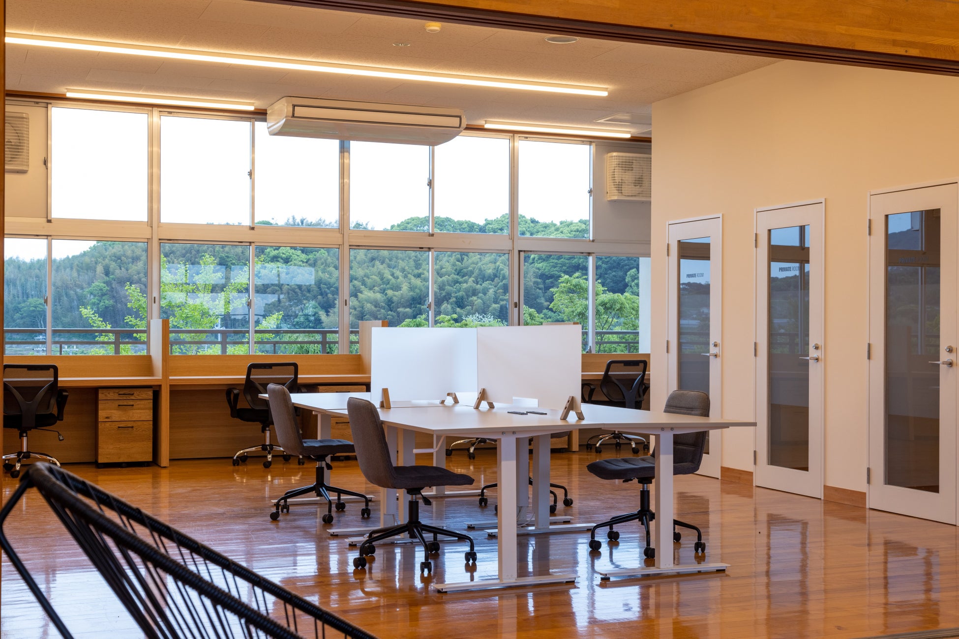 3階は、コワーキングやリモート会議利用など、淡路島でのワーケーションを可能にするコワーキングスペース「サトヤマデスク」。ハイエンドPC&モニター、高速回線を備えたテレワーク室も用意しています。