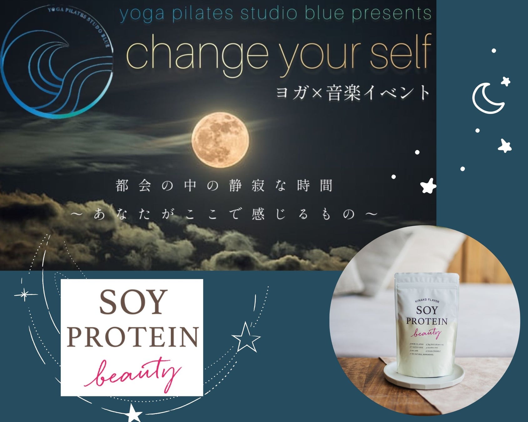 full moonヨガ&サウンドBath『Change your self, change the world』に人気のヴィーガンプロテインのソイプロビューティが協賛