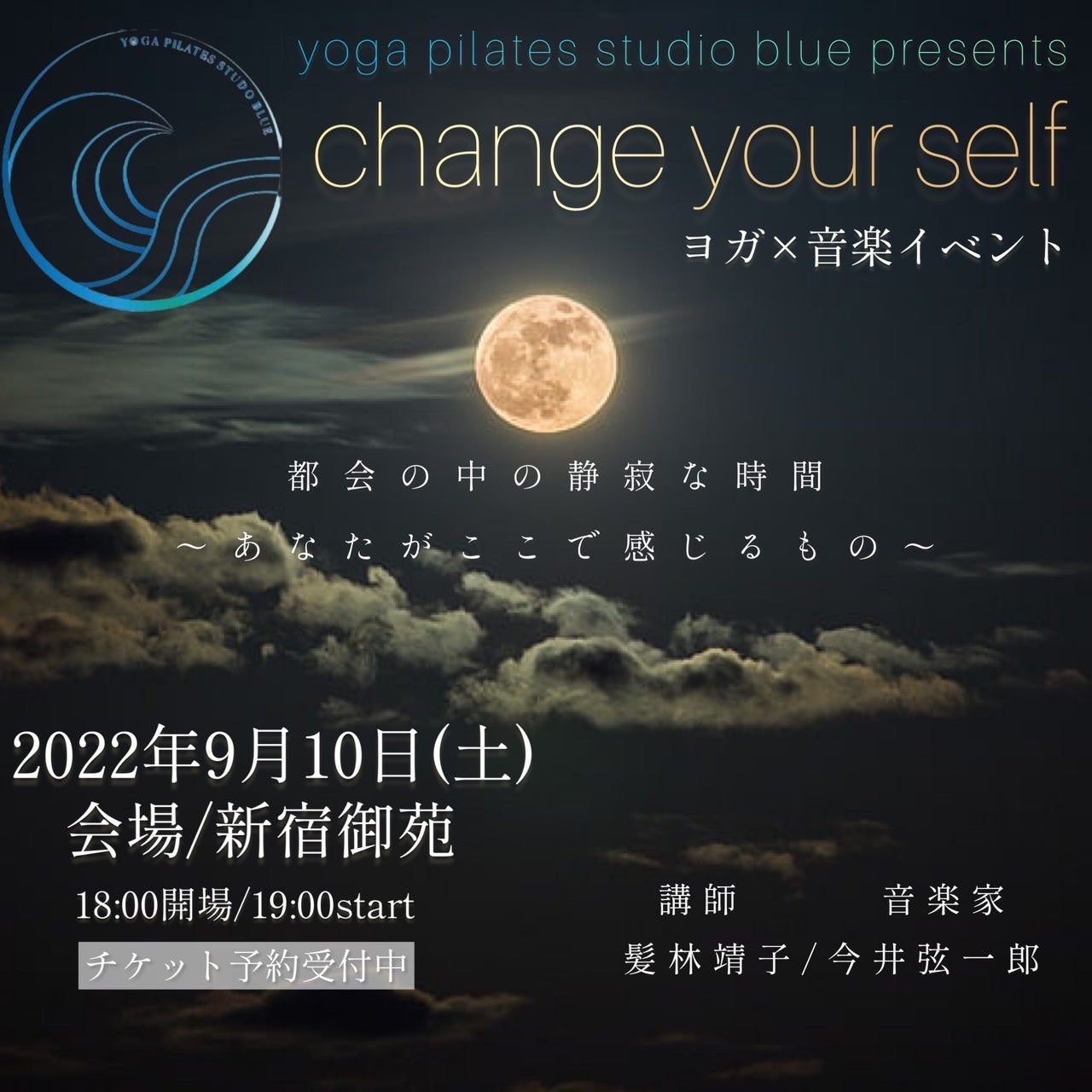 新宿の満月の夜空を独り占めにして、宇宙の摂理と繋がる「ブルースタイルヨガ」と、宇宙の音を奏でる音楽演奏家Sound8の宇宙を体験するイベント。
