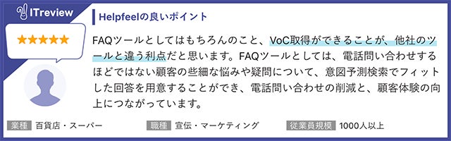今回の受賞に際しては、「Helpfeel」の直感的なUI、優れた検索機能、および手厚いサポート体制が高く評価されました。また「Helpfeel」の検索ログをVOCとして活用できる利点についても複数のコメントが寄せられており、「Helpfeel」をマーケティングに活用する企業が増えています。