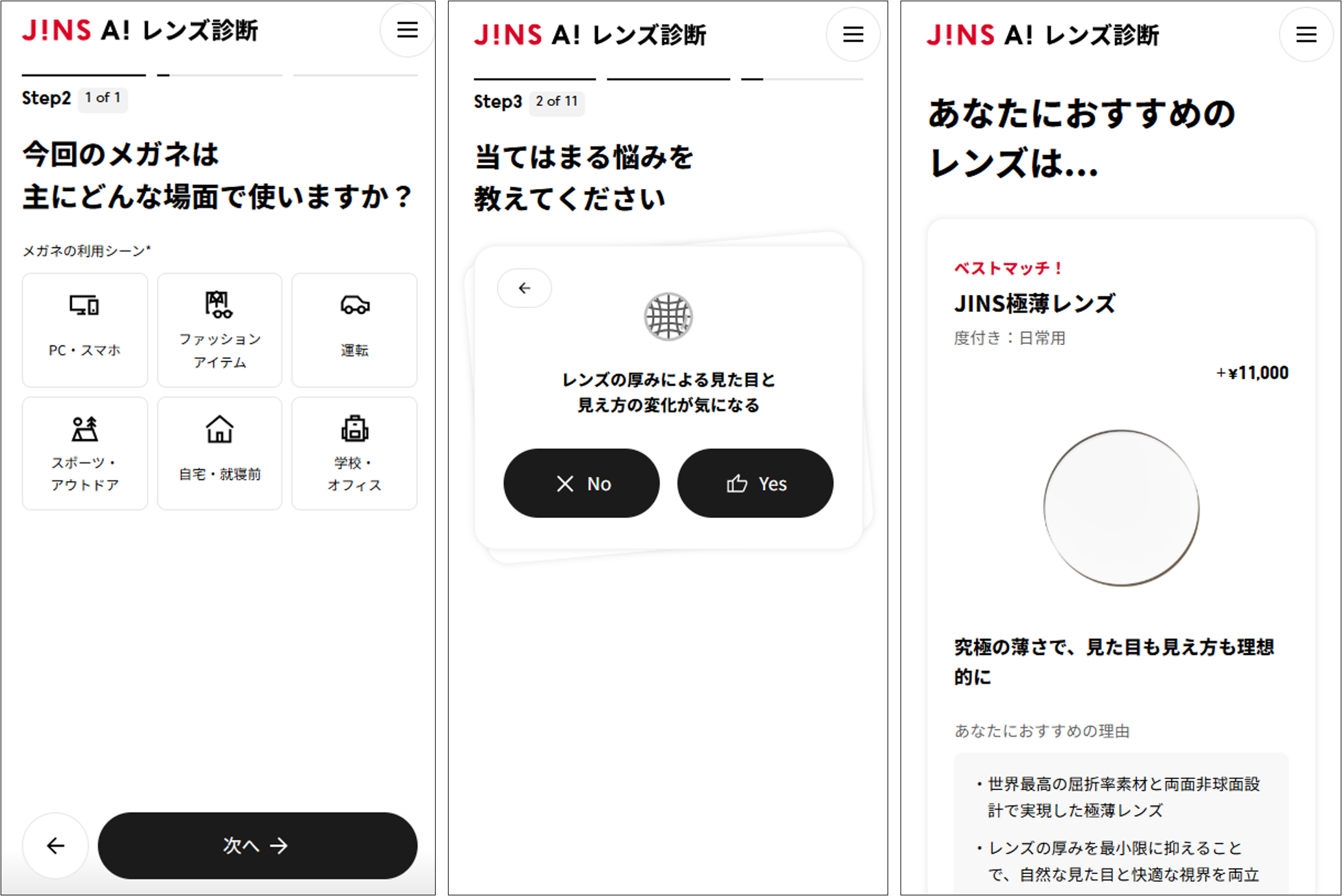 フレーム決定後の「レンズ選び」も、選択肢が豊富なため、お客さまが時間をかけて検討されるステップの一つです。JINSでは、あらゆるライフスタイルに応える多彩な機能性レンズをご用意していますが、「自分の使用シーンに最適な一枚」をよりスピーディーに見つけたいというお声もいただいておりました。
