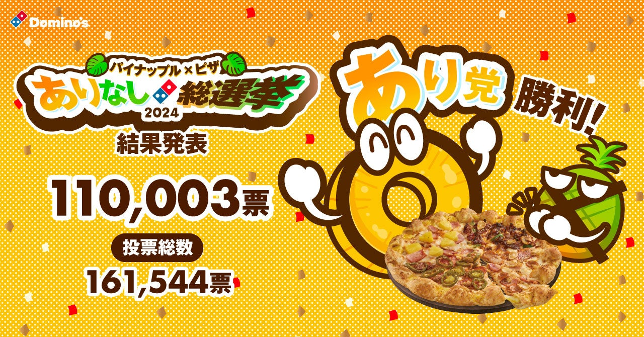 株式会社ドミノ・ピザ ジャパン(代表取締役:ジョシュア・キリムニック、CEO:マーティン・スティーンクス、本社:東京都品川区、以下:ドミノ・ピザ)が展開する国内No.1シェアを誇る宅配ピザチェーン ドミノ・ピザは、パイナップルをとことん堪能できる「極(きわみ)パイナップルツイスト・クワトロ」と「トロピカルツイスト・クワトロ」の「トロピカルツイスト」2種の発売に合わせ、「パイナップル×ピザありなし総選挙2024」を発売日の5月27日(月)~6月9日(日)まで実施。ピザにパイナップルをのせるのは、ありか?なしか?国民に信を問いてまいりました。このたび全て投票受付チャネルでの開票を終え、選挙結果は、”パイナップルxピザあり党”が68%の支持を得て、勝利を収めさせていただきましたことを報告いたします。