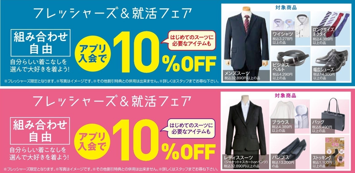 フォーエルが実施する「フレッシャーズ&就活フェア」では、体は大きくても足のサイズは小さいといった様々なお客様の声にお応えする為に、自分にピッタリなサイズを必要な分だけご購入頂けるようにという思いから、フォーエル公式アプリでフレッシャーズに必要なアイテム各種が10%OFFになるクーポンを配信しております。