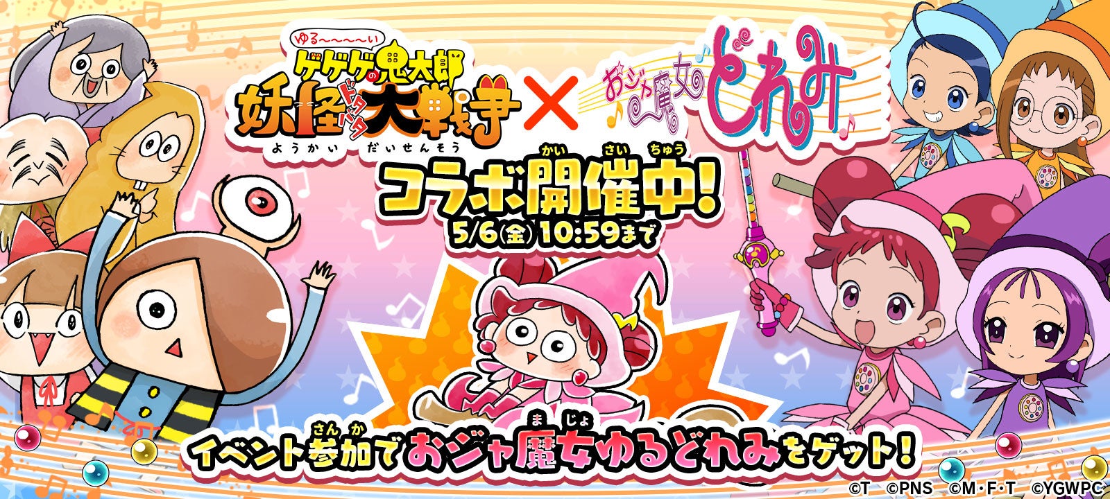 ゆるゲ大戦争製作委員会(配信・企画:東映アニメーション株式会社、企画・開発・運営:ポノス株式会社)は、人気アニメ『ゲゲゲの鬼太郎』を題材としたスマートフォン向けゲーム『ゆる~いゲゲゲの鬼太郎 妖怪ドタバタ大戦争』(略称:ゆるゲゲ)におきまして、アニメ『おジャ魔女どれみ』とのコラボイベントやコラボ限定キャラが必ず当たる特別なガチャの開始をお知らせいたします。