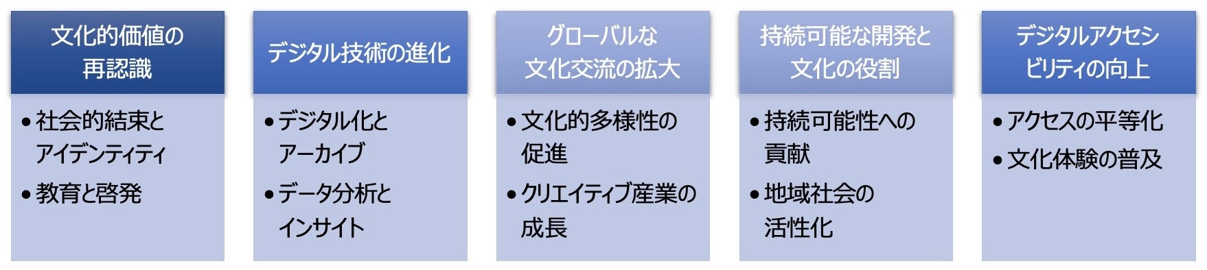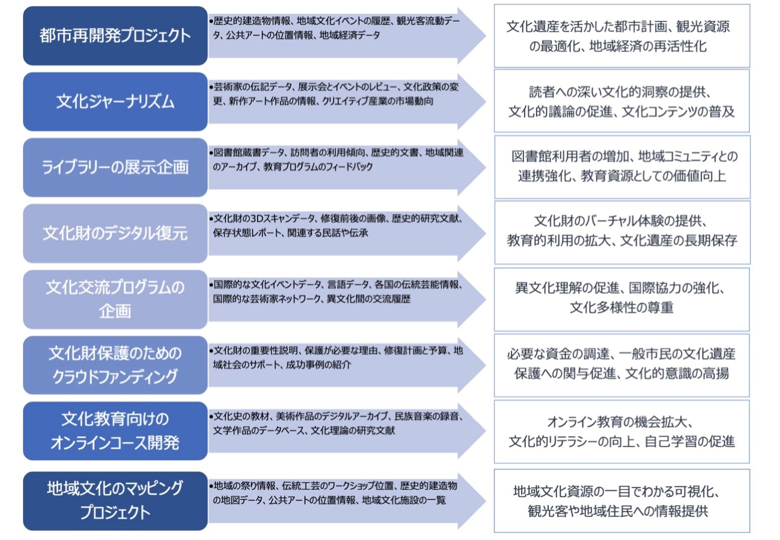 カルチャーデータの重要性が高まっている背景は、これらの社会的、経済的、技術的な変化によって、文化的資源が新たな価値を持ち、さまざまな形で社会に貢献する可能性が広がります。