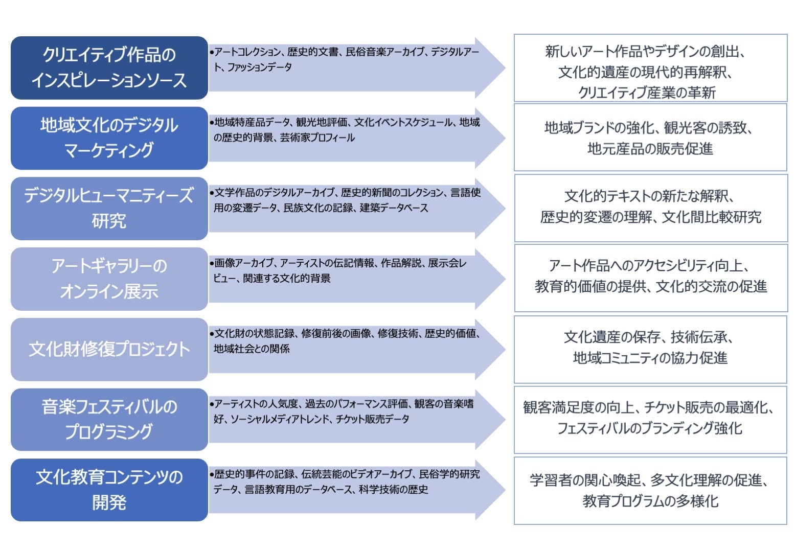 これらは、カルチャー分野のオープンデータが、文化的理解の深化、経済的価値の創出、教育の革新、社会的連帯の促進にどのように貢献できるかを示しています。