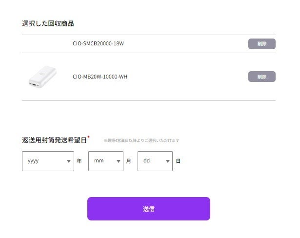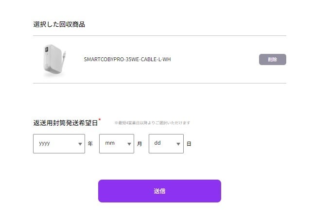 ご登録のメールアドレスの本受付URLより、回収する製品に誤りがないかご確認いただき、返送用封筒発送希望日をご入力ください。