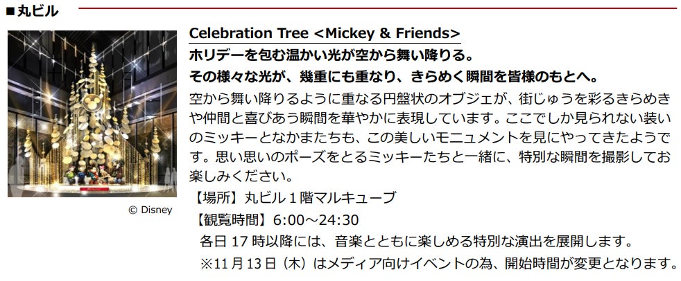 三菱地所株式会社は、2025年11月13日(木)から2026年1月4日(日)の期間、大手町・丸の内・有楽町(以下、「丸の内エリア」)にて、“MARUNOUCHI BRIGHT HOLIDAY 2025 「Disney JOYFUL MOMENTS」”と題し、よろこびや感動に包まれるディズニーの物語をテーマに、心ときめく瞬間と、あたたかな冬の季節の感動を大切な人と分かちあう、ホリデーイベントを実施します。
