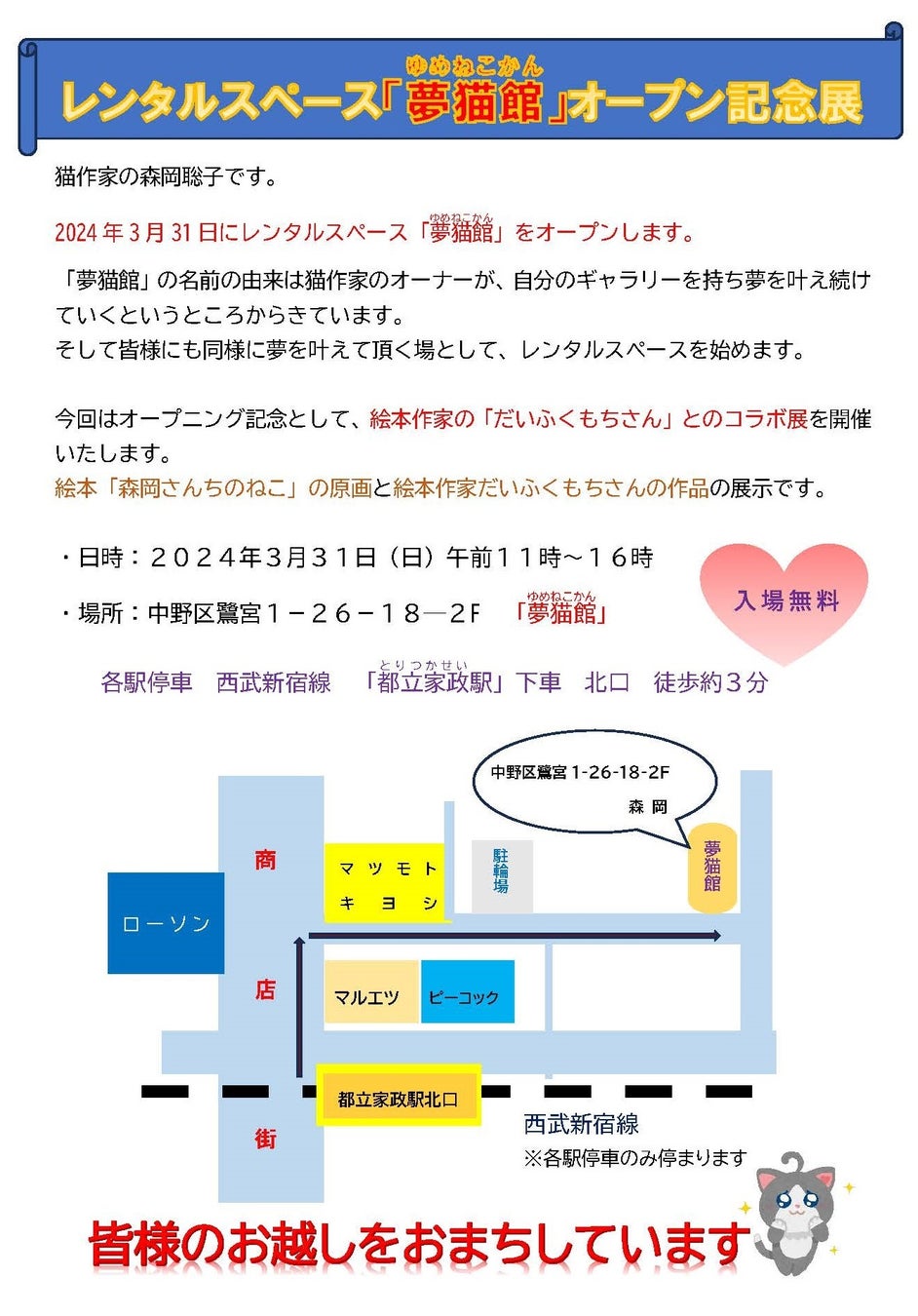 ねこ作家を目指すなか、自身の終活の一環として森岡家とねこ達との足跡を絵本で残すことにした『森岡さんちのねこ』シリーズの原画展を皮切りに、今年3月31日(日)にオープンします。「夢猫館」の名前の由来はねこ作家が自分のギャラリーを持ち夢を叶え続けるというところからきています。誰でもギャラリーとしてレンタル可能です。ご自身の作品を披露する場としてお使い頂けます。レンタルスペース「夢猫館」で貴方も夢を叶えてみませんか。