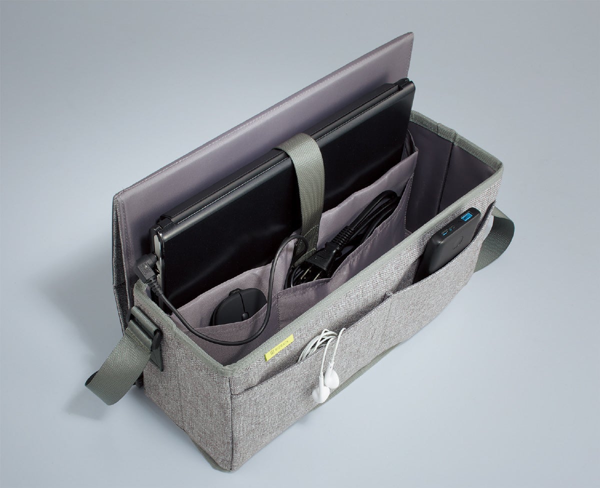 バッグの開口部が低いボックス形状なので、物を入れやすく、取り出しやすい。また、マウスやガジェット類を整理して収容できるポケット付きです。