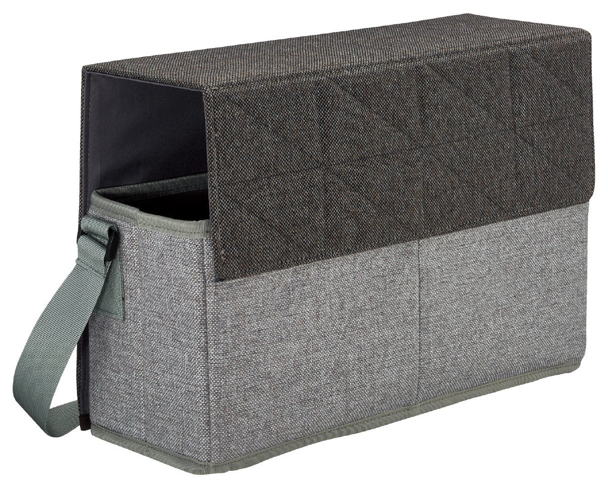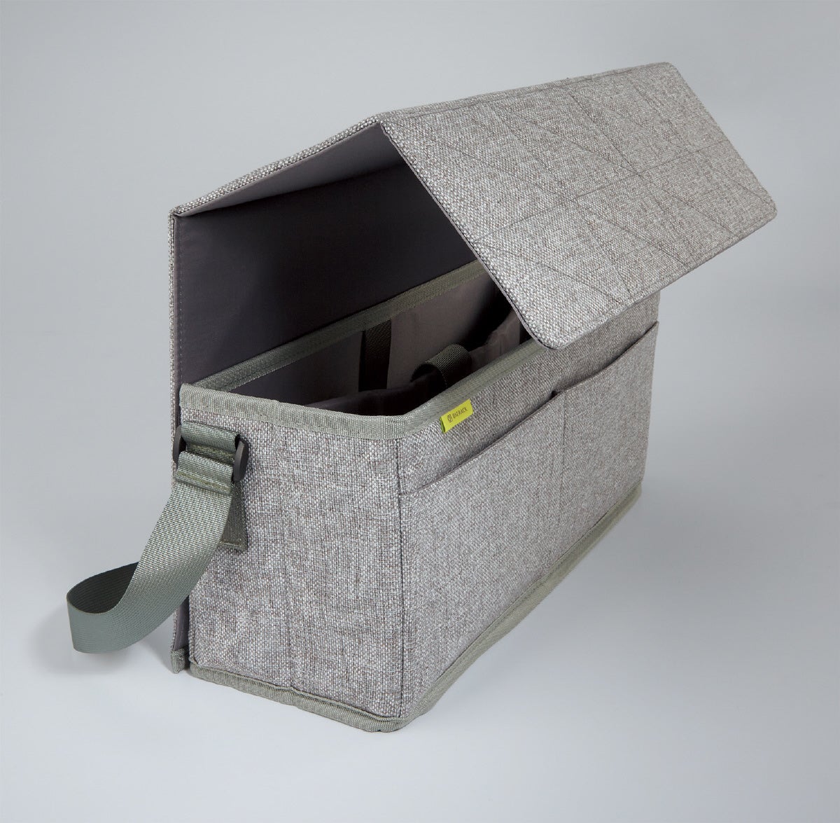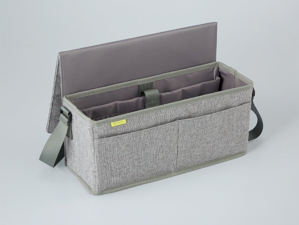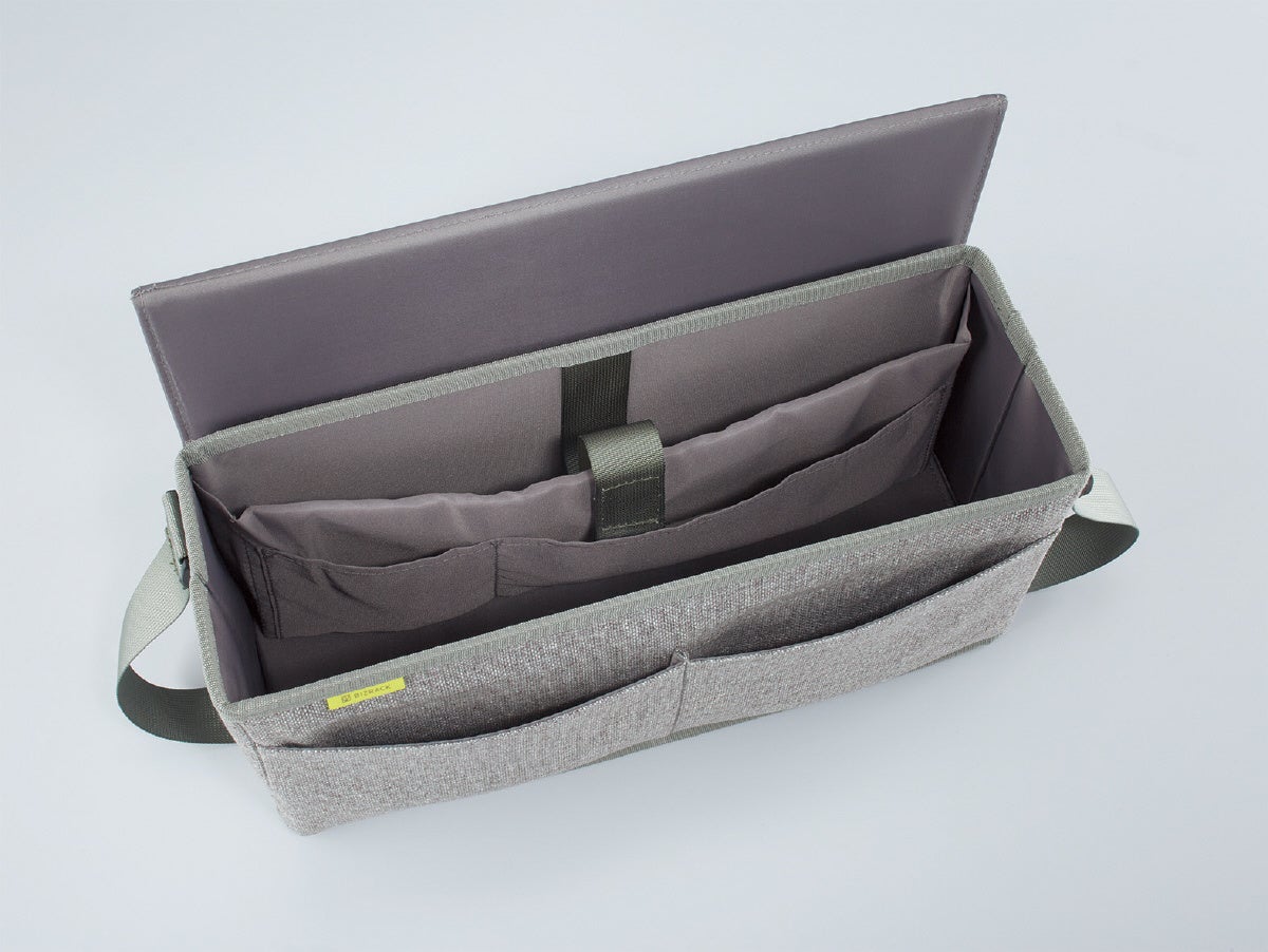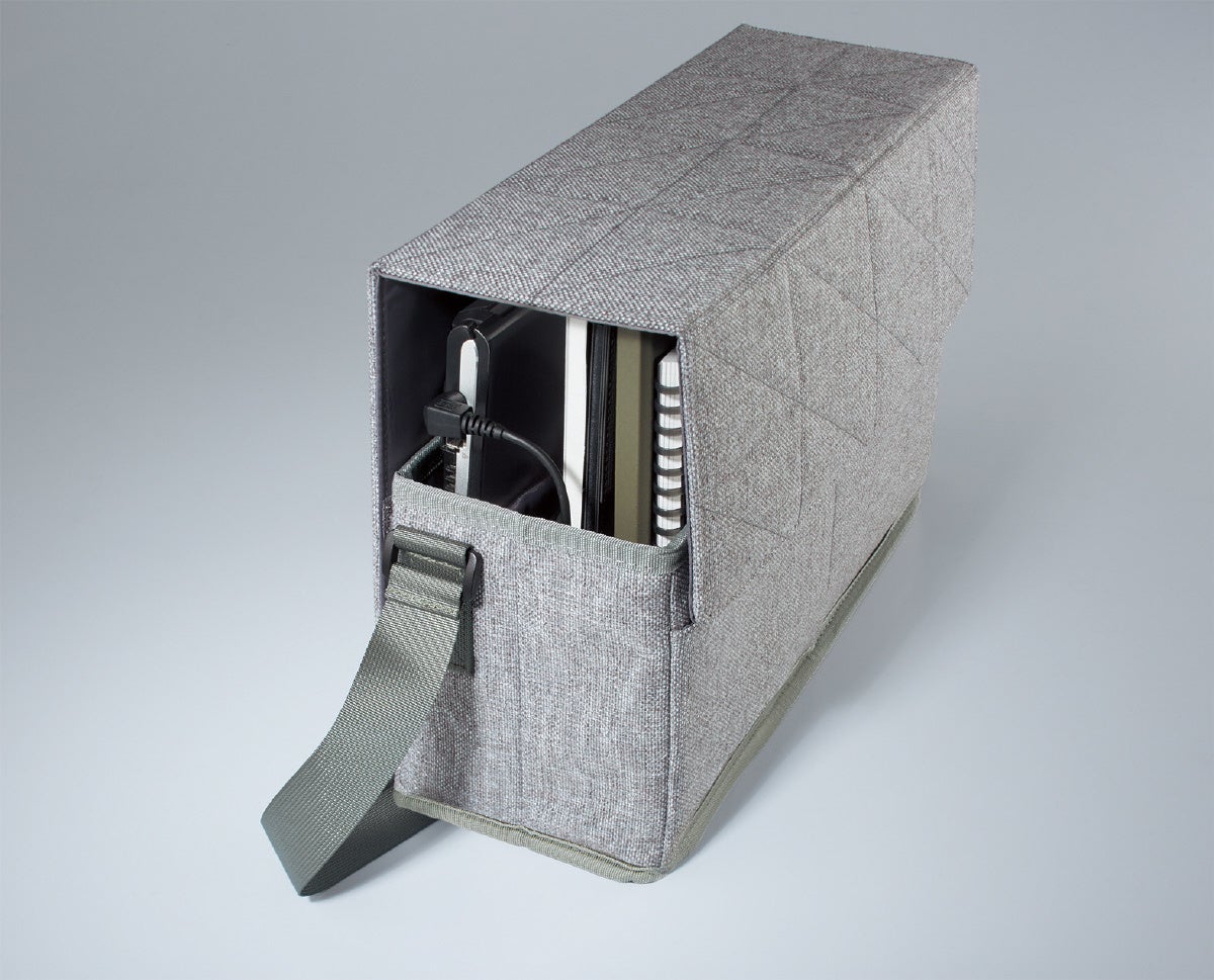ワークツールが入っていることを感じさせず、家庭のインテリアにもマッチする、キルティング生地を用いたデザインです。カラーバリエーションは、アッシュグレイと、ブラウンブラック&アッシュグレイの2種をご用意しました。