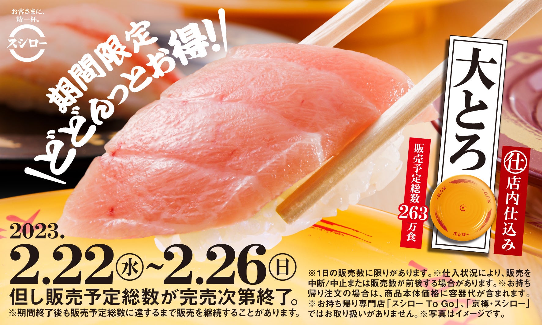 株式会社あきんどスシロー(本社:大阪府吹田市、代表取締役社長:新居 耕平)は、2月22日(水)から26日(日)の5日間限定で、全国のスシローにて「大とろ」を一番お手頃な黄皿でご提供いたします。