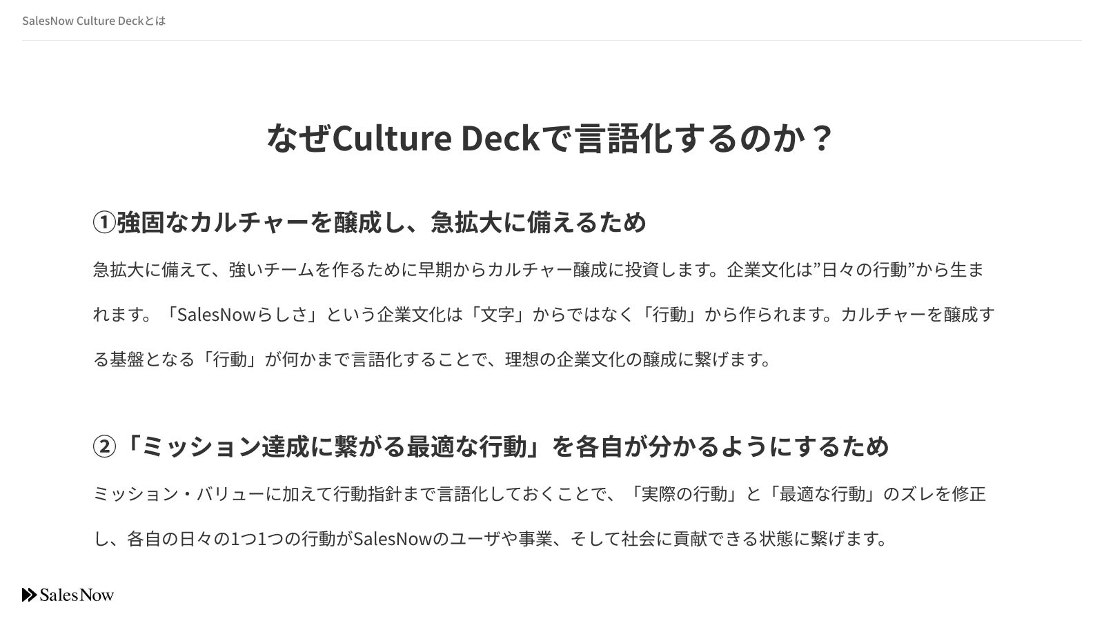 「誰もが活躍できる仕組みをつくる。」をミッションに掲げ、セールスチームの武器となるデータベース「SalesNow」を展開する株式会社SalesNow(本社:東京都渋谷区、代表取締役:村岡功規、以下「SalesNow」)は、Culture Deckをリリースしました。