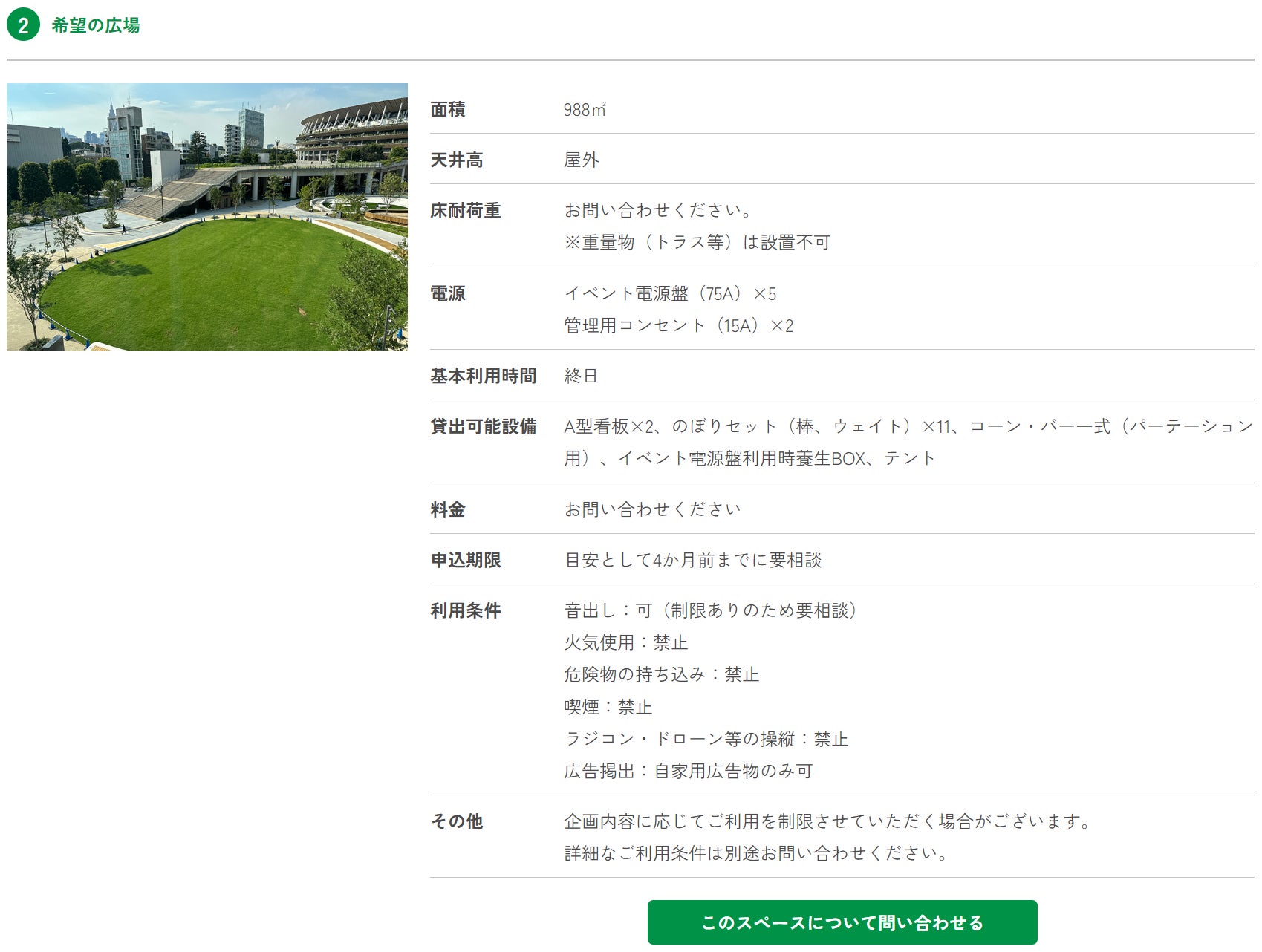 ※ 面積、天井高(屋内の場合)、床耐荷重、電源有無、利用時間、利用料金など。別途問い合わせが必要なスペースもあり。