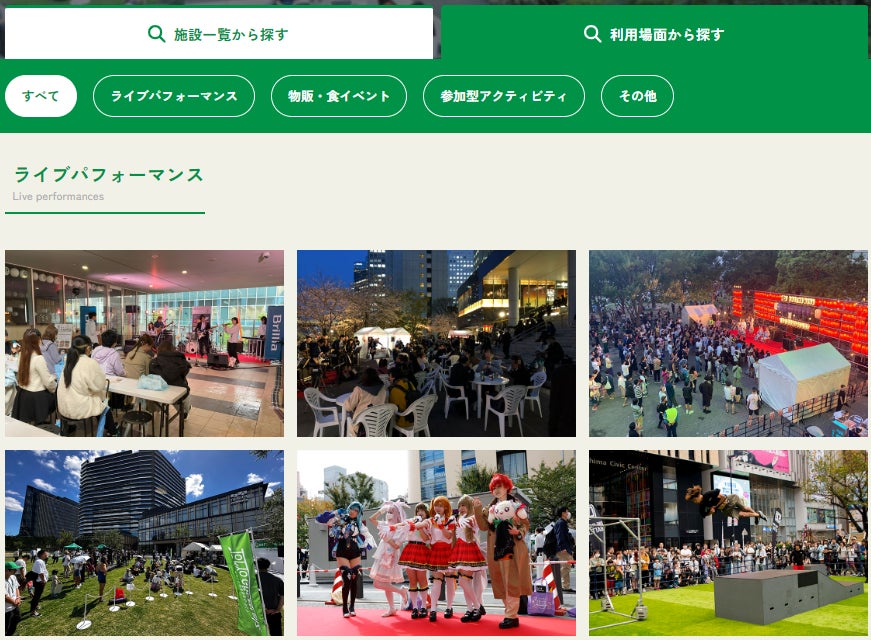 各スペースの活用実績を写真とともに紹介することで、イベント企画や撮影の具体的なイメージづくりに役立てられるようにしています。