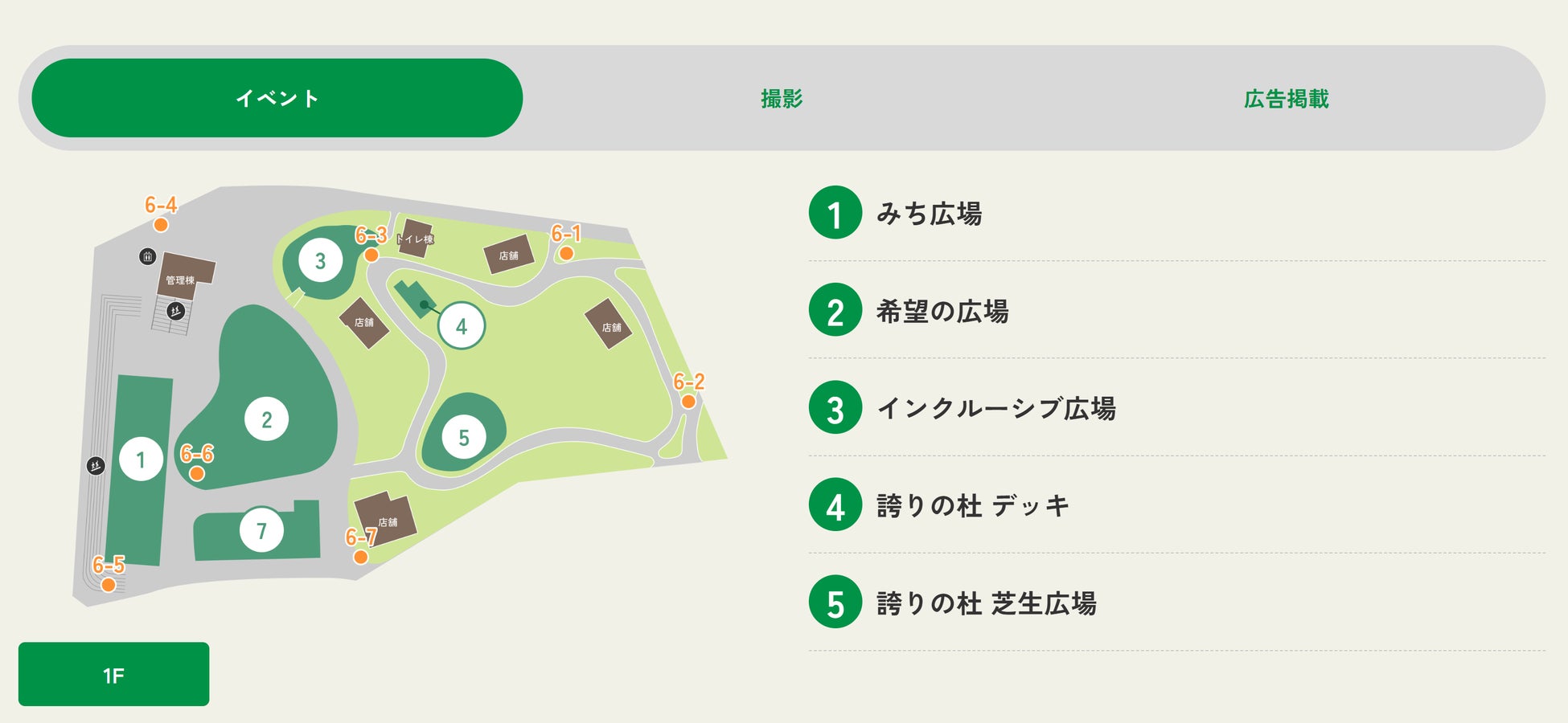各スペース内の利用可能エリアの確認や一体利用の検討のしやすさのため、スペースごとに詳細ページを設けています。詳細ページでは、イベント、撮影、広告掲載の3つのタブに分け、用途ごとに活用可能なエリアが表示される仕組みとしています。エリアごとの基本情報※や利用条件を掲載することで、事前の確認手続きが効率化され、企画から申請、活用までのプロセスがスムーズに行えるようにしています。