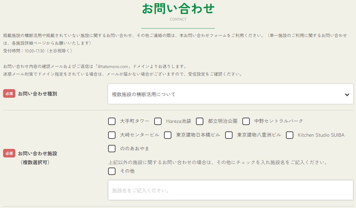 利用希望者は、問い合わせフォームを通じての利用相談も可能です。施設個別窓口の他、複数スペースの横断的な活用や、掲載されていない施設についても問い合わせ可能な総合窓口を設けることで、利用者の多様なニーズに対応できるようにしています。