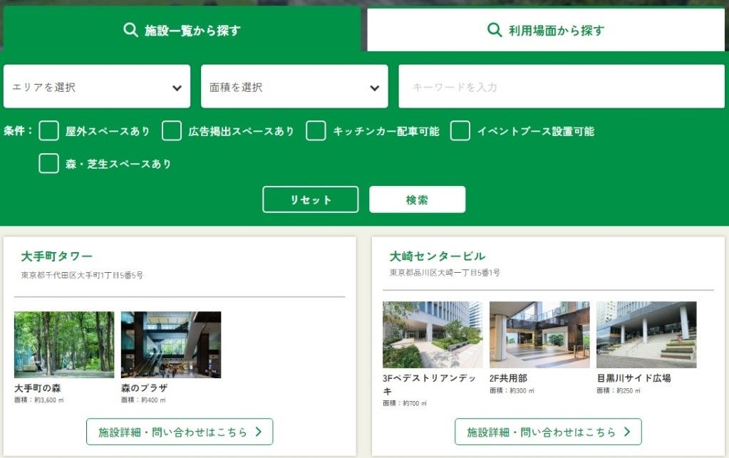 面積、エリア、利用条件などの情報を基に絞り込みが可能で、スペース同士の比較検討がしやすい設計としています。