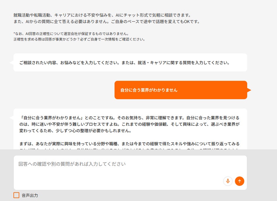 就職活動や転職活動、キャリアにおける不安や悩みを、チャット形式でAIに相談できます。(音声入力対応)
