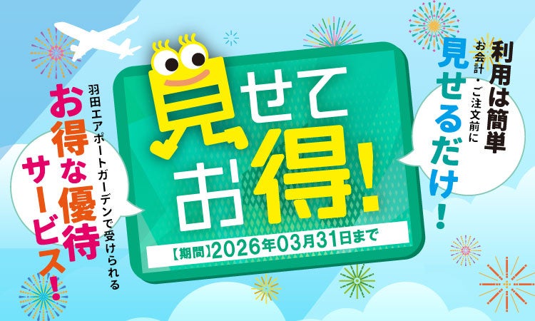 また、「住友不動産 ショッピングシティ 羽田エアポートガーデン」で実施中の優待サービス「見せてお得」も、今回のマイレージ施策と併せてご利用いただけます。対象のカードやレシートを提示するだけで、館内ショップ・レストランでお得な特典が受けられるサービスで、マイル付与と組み合わせることで、よりお得に館内をご利用いただけます。