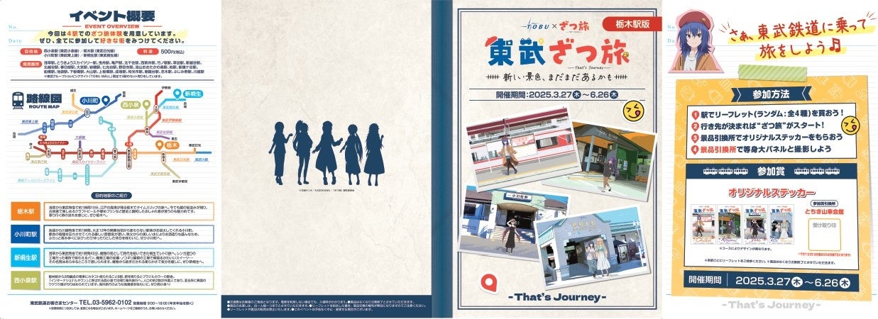本イベントは、「ざつ旅」の主人公と同じく行き当たりばったりな旅を、東武沿線を舞台に疑似体験できるものです。行き先の候補となる4駅(西小泉駅・新桐生駅・栃木駅・小川町駅)のいずれか1駅の観光スポットなどが記載されたリーフレットを購入いただき、ランダムで当たった対象の駅に足を運んでいただくことで「ざつ旅」体験をしていただきます。対象の4駅は、異国情緒あふれる雰囲気、織物の街、小江戸の歴史を感じさせる街並み、ふら呑みにピッタリな酒処と個性あふれる魅力的なスポットです。主人公・ちかになりきった気持ちで、ぜひ東武沿線で新たな景色や思いがけない出会いをお楽しみください。