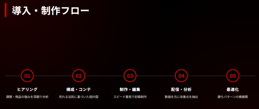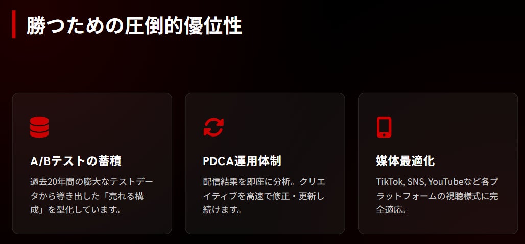本サービス最大の武器は、2,600回以上のA/Bテストで実証されてきた『最強の売れるノウハウ®』を、台本・構成・演出・尺・訴求順に至るまで完全反映している点にあります。
