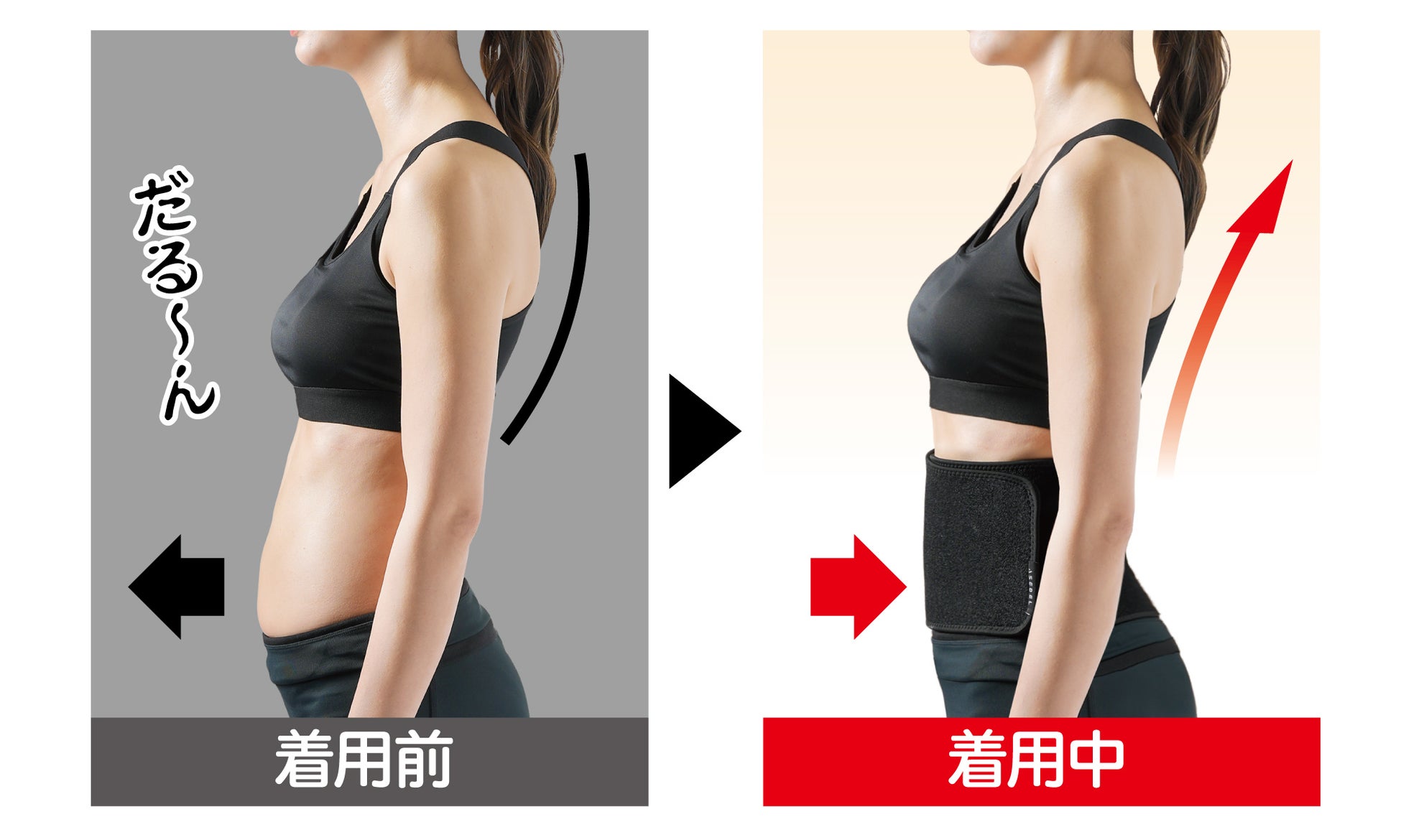 ウエストをベルトでぎゅッと360°引き締めることでウエストラインが引き締まります。また、お腹や腰まわりが安定して自然と美姿勢を意識できます。