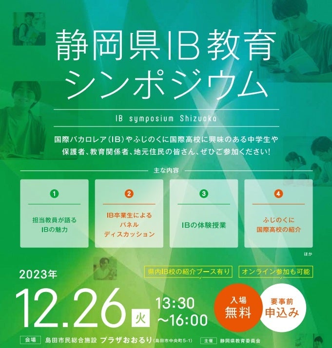 3 主な内容 県教育長や島田市長のあいさつ、担当教員が語るIBの魅力、IB卒業生のパネルディスカッション、IBの体験授業 など