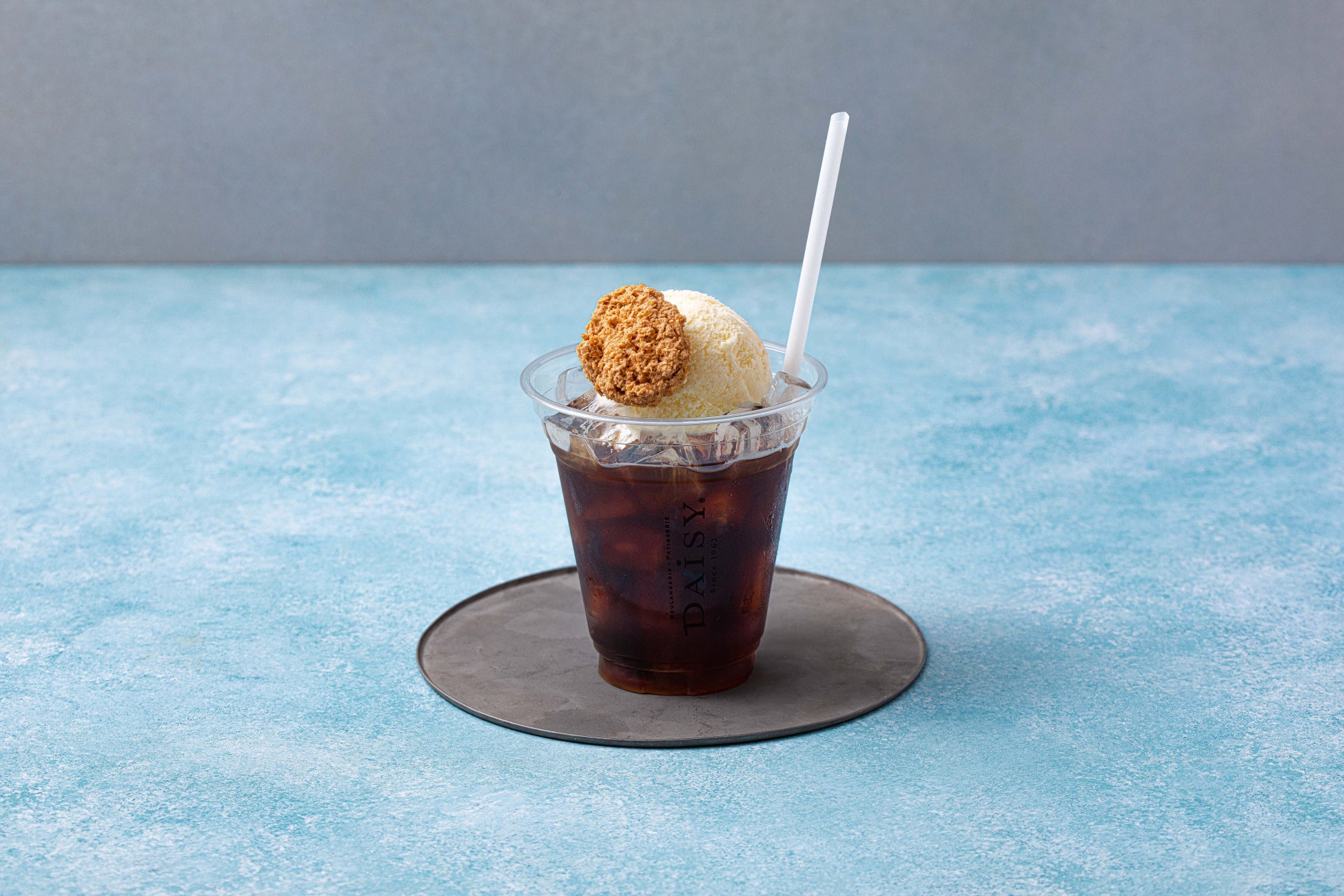 深煎りコーヒーの苦み、バニラアイスの甘みが絶妙なバランスの1杯です。アクセントのココナッツクッキーは、ザクザク食感と香ばしさが魅力の名脇役。