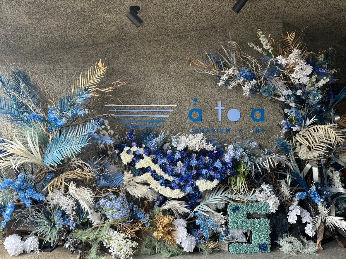 アトアのロゴ前にはフォトスポットが登場。フラワーアレンジメ ントで“5 周年=ゴール”ではなく、ここからさらに深く美しく進化していく姿を表現しています。深海に差し込む光が空間を巡り、未来へと続く世界観を演出しています。