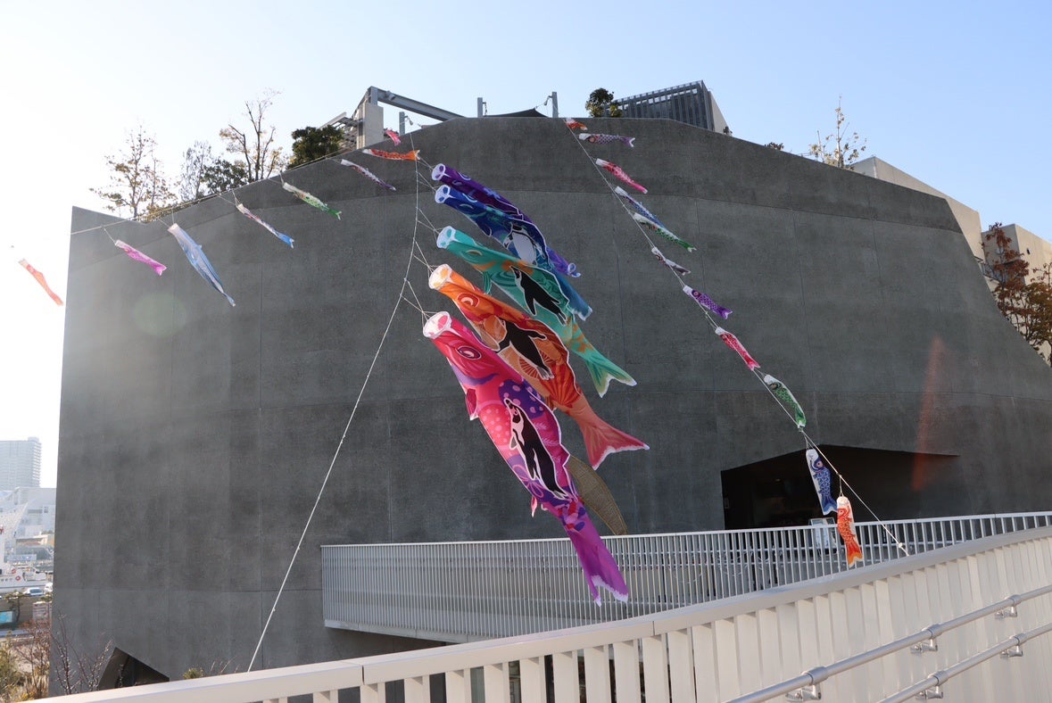 アトアが入る KPM 前には、カラフルな鯉のぼりが登場。 5 周年にかけて、全長約5mの 5 匹の鯉のぼりが皆さまをお迎えします。 オリジナルの鯉のぼりは、顔立ちは伝統的なスタイルを継承しつつも、生息地や分類、大きさなどにこだわらない多様な生きもののモチーフをデザインいたしました。 そして、鯉のぼりに大きくあしらったのは、金太郎ではなくフンボルトペンギ ンです。まさに生きものとアートが融合した世界のどこにもない鯉のぼりです。