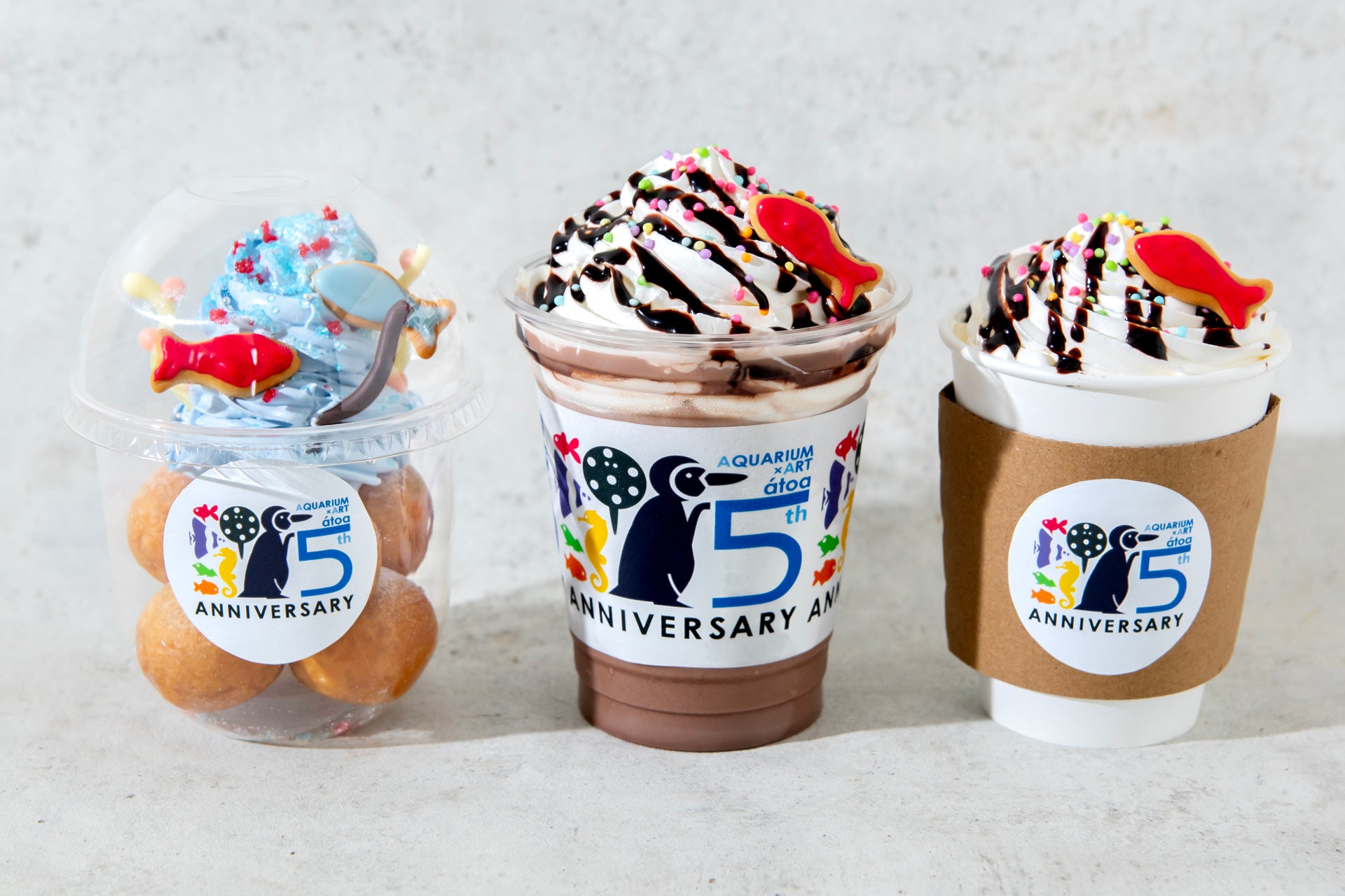 アトアカフェに『5周年限定』メニューが登場! 球体水槽「AQUA TERRA」をイメージした「わらびもちドーナツ」や、大人から子供まで人気のココアに 5 周年アニバーサリーのロゴとマッチした華やかな色彩のトッピングを行ったココアド リンクを販売します。