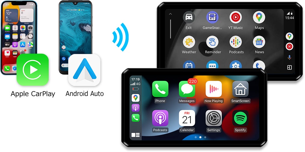 スマートフォンとワイヤレス接続するだけで、スマートフォンに入っているナビアプリや音楽を本機で使用できるようになります。一度接続すると、次回からバイクのエンジンを始動すれば自動でワイヤレスCarPlay/Android Autoが接続されます。
