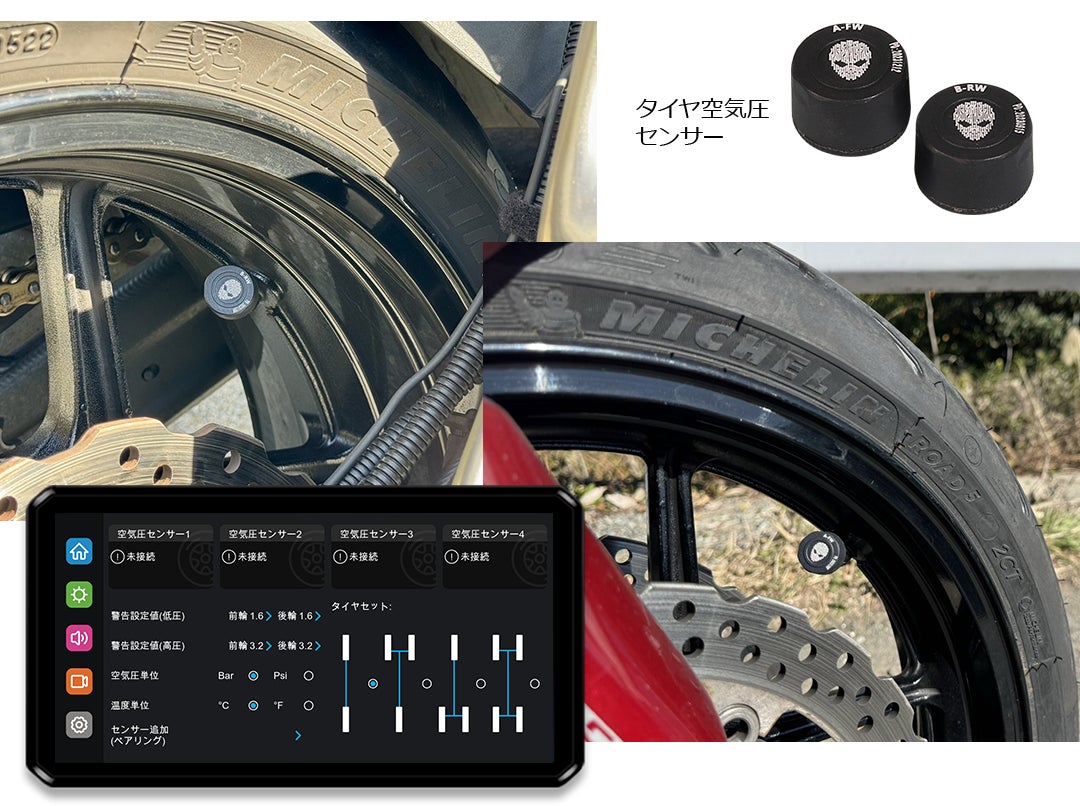 「空気圧」や「タイヤ温度」を秒間隔でモニタリングするタイヤ空気圧監視システム搭載。高圧・低圧の警告値の設定が前輪・後輪別々に設定できます。タイヤの異常をすぐに察知できます。
