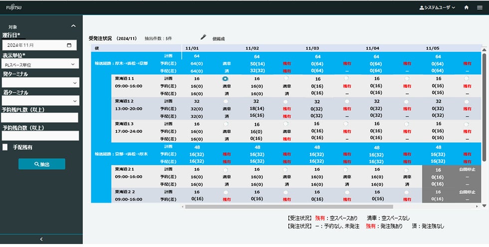 本システムは、富士通のオファリング「Fujitsu Unified Logistics」によるデータ基盤を活用しており、荷主企業の出荷計画や梱包の状態(荷姿)、荷物量などの情報と、物流事業者の運行計画をもとに、最適な輸配送計画を作成します。荷主企業は共同輸配送のパートナーを自ら探すことなく共同輸配送に取り組むことができるだけでなく、同一区間でも複数の時間帯・複数の輸送手段の中から標準パレットスペース単位で最適な輸送方法を選択できるため、効率的な輸送を実現できます。物流事業者は、復路の空車走行の減少(帰り荷の確保)などによる積載率や稼働率の向上、ドライバーの負担軽減や処遇改善を図ることが可能となります。 -